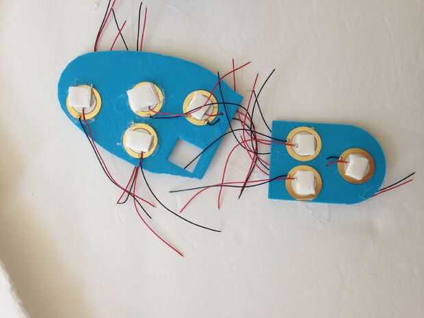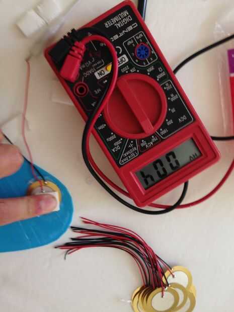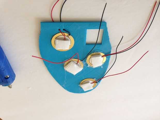 Una vez que hemos terminado de crear la base para nuestro generador piezoeléctrico, su tiempo caliente pegamento en. Encontré que la mejor técnica para pegar los elementos en el tablero era aplicar una capa delgada de pegamento alrededor del borde del orificio en el plástico, entonces rápidamente presionando el piezo elemento en la cola antes de que se enfríe. Tenga cuidado de no aplicar demasiado pegamento, o bien puede limitar las esponjas (que va pegadas en la parte superior los elementos piezo) de compresión totalmente. También, asegúrese de que el pegamento no cubre los puntos de contacto de los cables negros o rojos, debido a se suelda a esos puntos pronto. Asegúrese de que usted pega elementos piezoeléctricos en ambos lados del plástico. Si tienes un multímetro, puede asegurarse de que sus elementos piezoeléctricos trabajan estableciendo el multímetro en voltios de CA y presionando sobre el piezoeléctrico. Después de haber pegado todo el piezoeléctrico en sus puntos adecuados, entonces puede pegar las piezas de espuma y cartón en cada elemento piezoeléctrico.