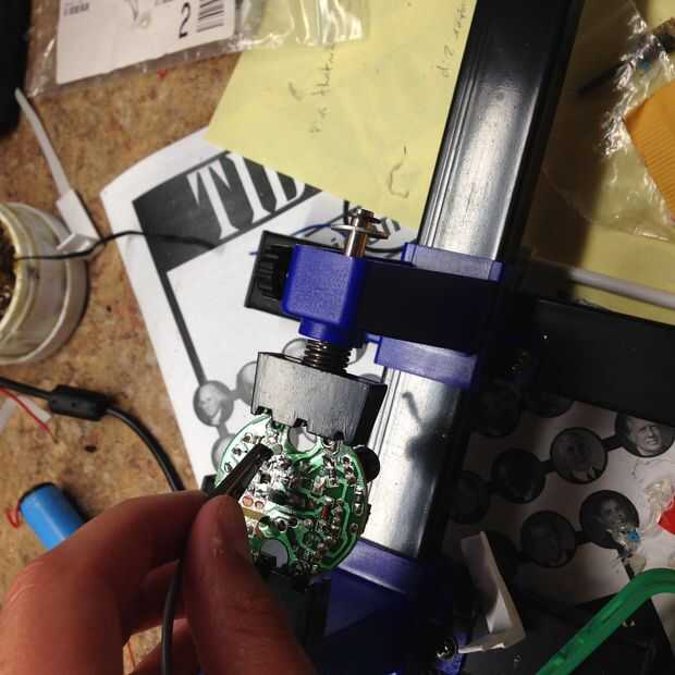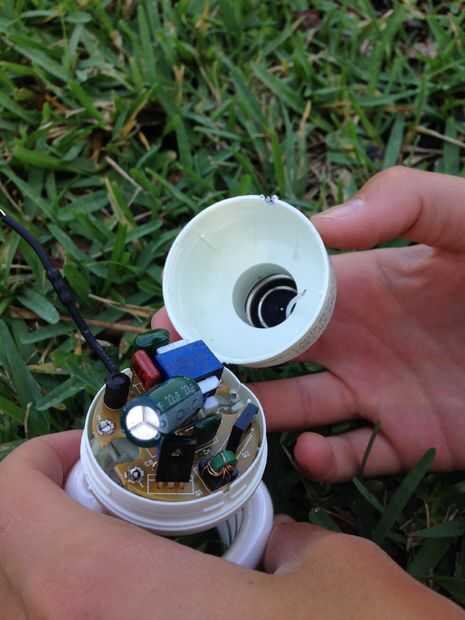 - Una vez que el bulbo ha partido aparte, usted notará que la PCB dentro está siendo retenido por dos cables conectados a la base metálica de la bombilla. Puede cortar estas como una persona civilizada o hacer lo que hice, que fue tirar continuamente hasta que los cables se rompieron.