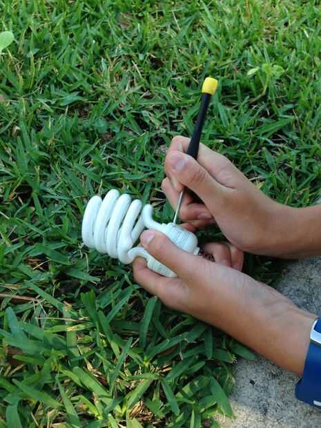 - Ubicar la costura por la cual las dos mitades plásticas de la bombilla CFL están conectadas y comienzan a desalojar cuidadosamente las dos piezas apartes con su destornillador.