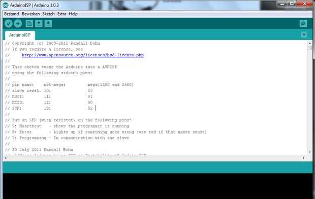 Luego carga el arduino como bosquejo de la ISP en otro tablero de arduino (en este ejemplo, Arduino Uno)