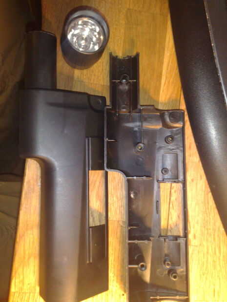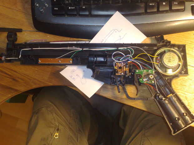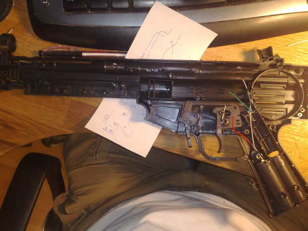 Mismo con el MP5: Afloje todos los tornillos. Hice un dibujo pequeño que muestra en que tornillo es porque tenían diferentes longitudes. Había también un anillo en la boca, que tuve que cortar y la linterna, porque estaba pegado. Parece que los chicos allí en china querían asegurarse de que nadie está copiando cosas allí. =) Retire todo el material eléctrico en allí pero ten cuidado con la unidad de disparo. Lo utilizado en lugar de construir allí un nuevo botón.