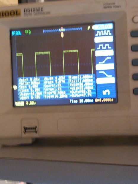 Este alcance o muestra la salida de frecuencia de onda cuadrada 8 voltios 14,5 Hertz de los electrodos de penny.  Estas monedas se pondrá en mi piel.
