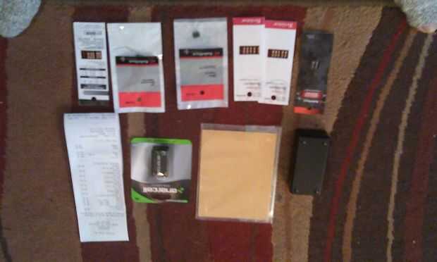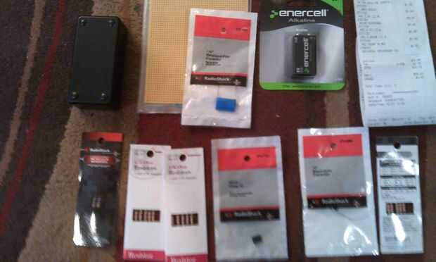 como yo puedo haber dicho antes, cuesta unos 40 dólares lo que hice como me compré componentes extras como tuve que comprar en paquetes de más de necesario. Aquí está la mayoría de las cosas que necesitaba para hacer el proyecto. Aquí están todas las resistencias (excepto 10 picofaradio condensador y un resistor de k 39) más abajo está el cuadro plástico proyecto vero tablero, tapas, resistores, batería. todavía necesita un interruptor y una toma de corriente de ic para el 555. ¡ Resulta más adelante que el cuadro era demasiado pequeño, pero terminé usando de todas formas al poner la batería en el exterior.