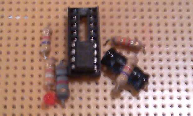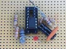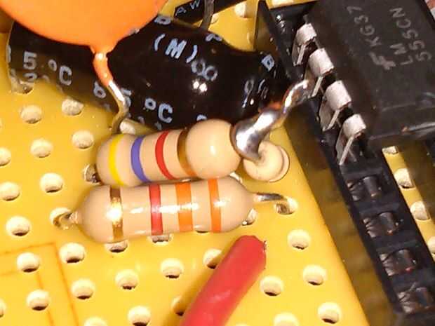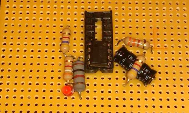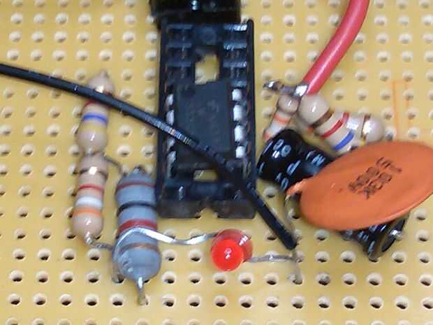 Estas son solo fotos de mi poniendo los componentes en la placa de velo. Intento recrear el esquema con piezas reales. Puede ser un buen ejercicio para averiguar qué agujeros a utilizar y cómo conseguir estas piezas juntos. El 555 tiene pernos que comienzan con el pin número uno en la esquina superior derecha de la viruta. La esquina superior derecha también tiene una depresión para denotar el pin número uno. Perno cuenta las manecillas del pin uno.