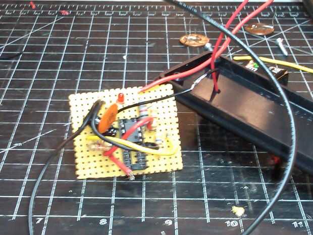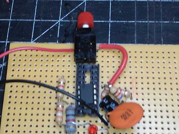 También observe que el LED va a ser había sustituido en el futuro fotos como el proyecto se mueve a lo largo de. Estoy usando este LED para simplemente probar el circuito en el tablero del velo antes que poner en la caja de proyecto. También el botón rojo en la parte superior del circuito es un encendido apagado interruptor que estoy usando tempararily y negociará con más resistente interruptor más adelante. El interruptor y el LED se montará en el cuadro de proyecto.