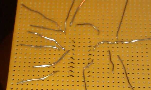 Acabo de poner los componentes donde podía y soldar la parte trasera de la Junta de velo. Yo soldado todos los cables juntos que debían soldarse juntos. Había soldado los cables hasta el final de los componentes en la parte posterior de la Junta de velo, aunque la soldadura se muestra en el siguiente paso. En estas fotos puedes ver todos los cables de los componentes que se pega por la parte posterior de la Junta de velo esperándome cortar y soldar.