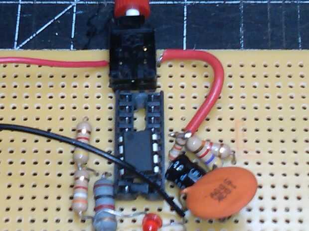 en la parte superior de esta imagen hay un botón rojo que cierra el circuito. Lo utilizado temporalmente para probar el circuito antes de empezar a montar el circuito en el cuadro de proyecto. Aviso seis resistencias, dos condensadores, un LED, un botón interruptor, un 555 IC en un zócalo del IC.
