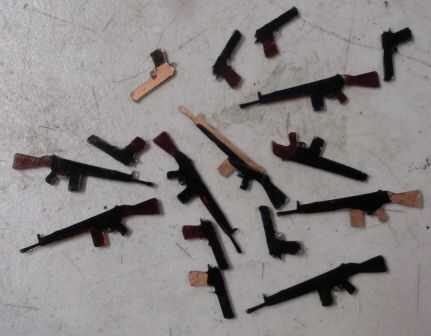 Para las armas, ordenaron muchos juguetes de armas para figuras de acción pequeña pero ninguno llegó a tiempo. Así, en su lugar unos contornos de arma fueron encontrados en la web y utilizados para cortar muestras de acrílico transparente. Éstos entonces fueron pintados para demostrar para arriba.