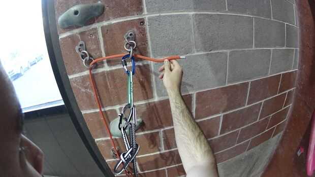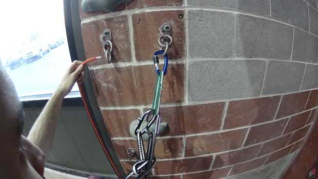 Cadena el extremo de la cuerda por el último eslabón (inferior) de ambas cadenas y crear un lazo atando un nudo simple en extremo de la cuerda para que la cuerda caiga accidentalmente.