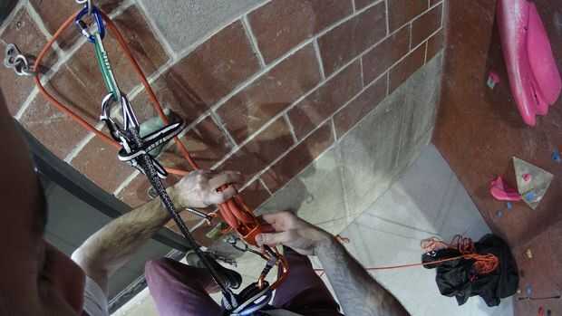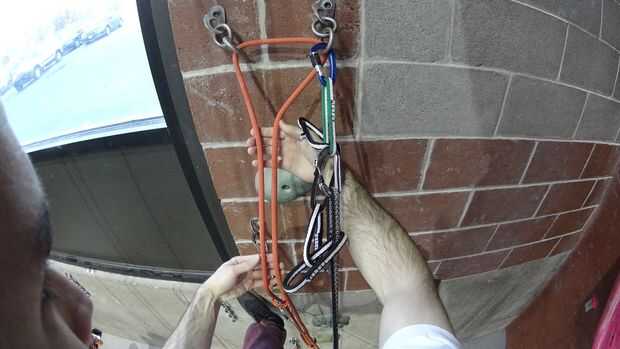 Tomar dos trozos de cuerda que están colgando hacia abajo y pase a través de descensor como se muestra en la imagen.