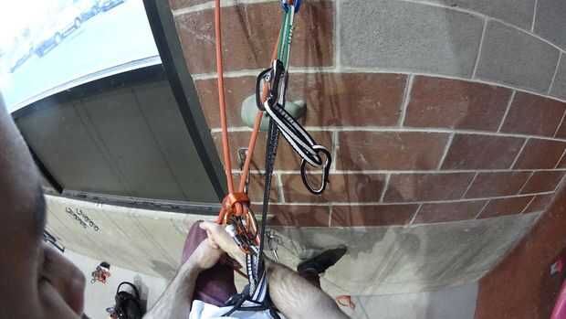 Cinche usted mismo para arriba cerca de cadenas tirando cuerdas hacia abajo a través de descensor que no existe ninguna tensión en el ancla.
