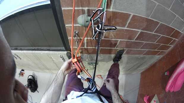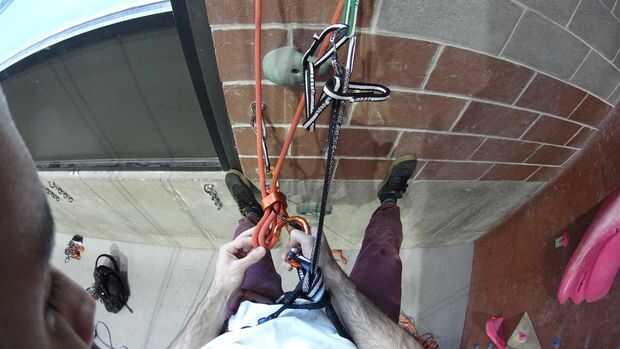 Clip de dos hebillas en los pasos 4 y 6 para el mosquetón. Apretar el mosquetón en preparación para el rappel.
