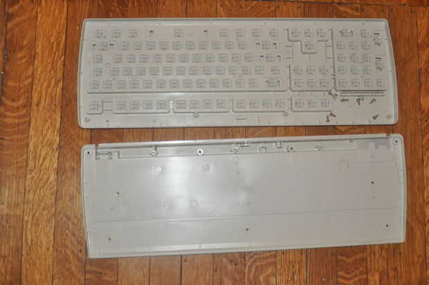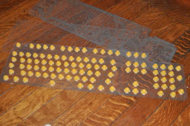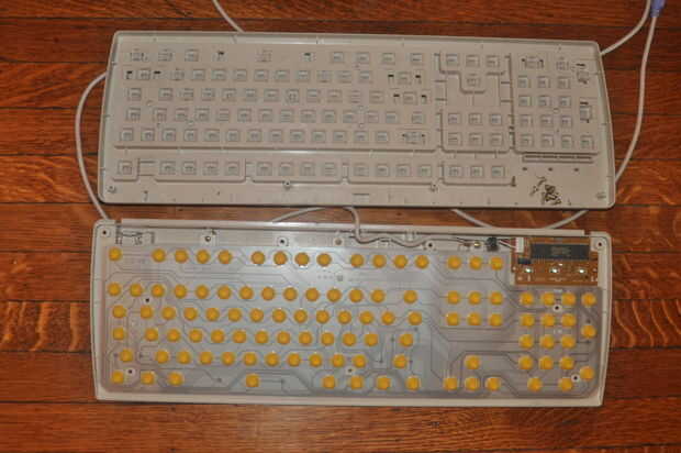 Desarmar el teclado es muy fácil. Todo lo que tienes que hacer es desenroscar un par de tornillos. Guarde los tornillos para más adelante. Una vez que se levante el teclado abierto, tienes un montón de enfriar materiales de construcción. Usted tendrá tres circuitos de teclado, un montón de poco ventosas, un chip, una placa metálica y cosa de goma raro. Si eres un DIYer, guarde todos estos materiales! Estos son los materiales de construcción muy fresco que usted puede construir cosas interesantes como esta.