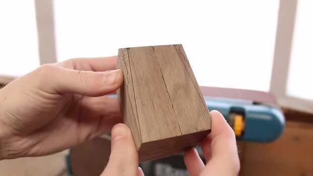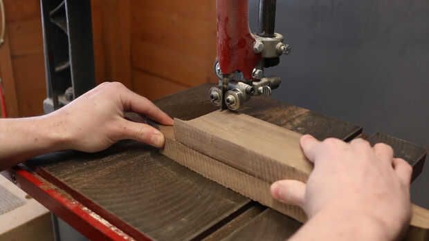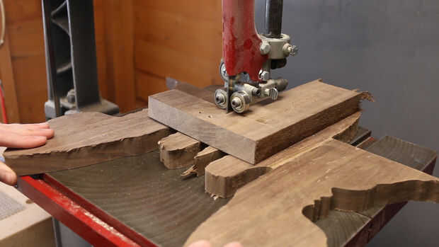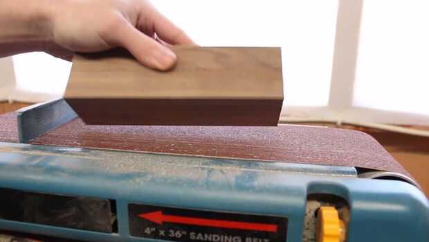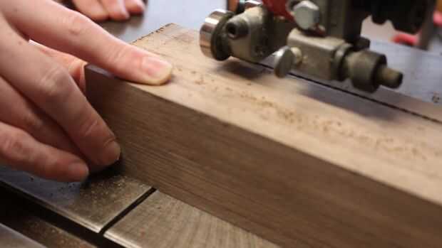 Quería una base gruesa así que pegué 2 pedazos de nuez gruesa de 25mm para crear una pieza gruesa de 50mm. Utilicé una sierra de banda para áspero cuadrado el espacio en blanco y usé una lijadora para quitar las marcas de la sierra.