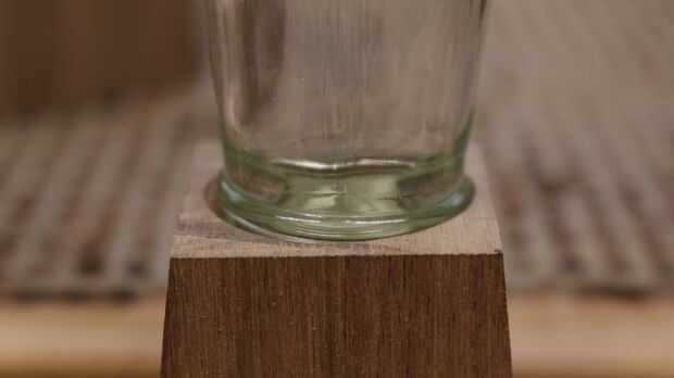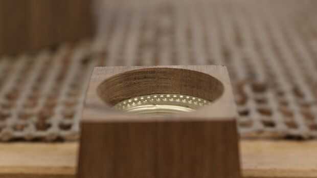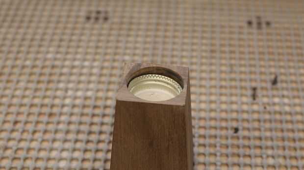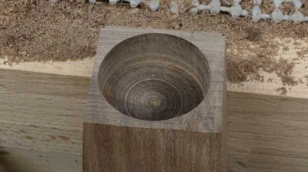 La parte superior de la botella a la botella de zeo mide aproximadamente 28mm. Así que usé una pieza Forstner de 30mm para perforar un agujero en la base de que lo pude arreglar la parte superior en.