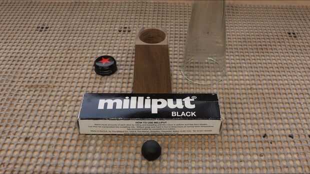 Yo rodé la Milliput en una pequeña bola y apareció en el fondo del agujero que había perforado. Entonces empuja la tapa de la botella en el agujero y limpiar cualquier Milliput que exprimido hacia fuera alrededor de los lados. Revisé para ver si era nivel y hasta alrededor de los bordes y luego a la izquierda para fijar durante la noche.