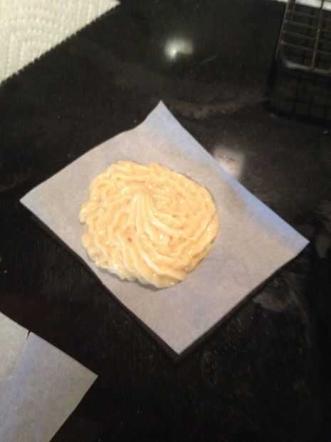 Para la masa colocar 1 taza de agua y 5 T de picado en una cacerola y poner a fuego medio. Una vez que el agua comienza a hervir y la mantequilla derretida es calor y añadir 1 1/2 taza de harina. Revuelva hasta que se forma una bola. Volver al calor y dejar reposar 5 min para que se seque la masa. Ahora deje que la masa se enfríe. Una vez fría tomar la cáscara de 1 limón y una pizca de sal y revolver. Batir tres huevos uno a la vez. Ahora poner la mezcla en una manga pastelera con una pipa de punta de estrella círculos en hojas de papel de 3 "X 3" pergamino.