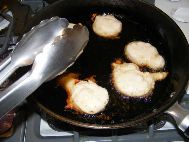 Dependiendo del nivel de aceite que tienes en la bandeja o una maceta, necesita voltear el zeppole cuando esté dorado por un lado.