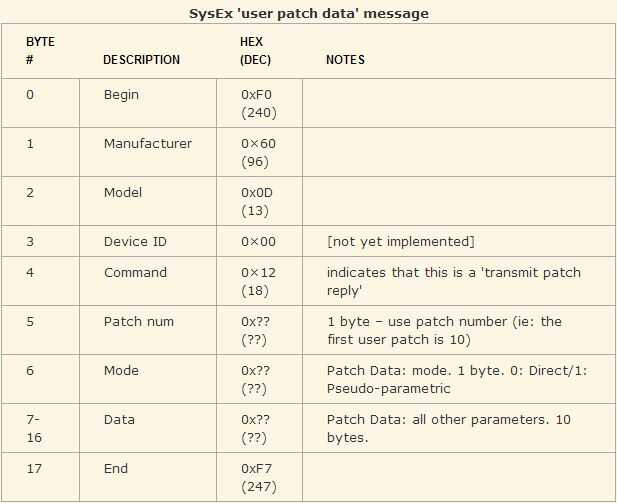 - Implementación de SysEx de la Reticuli Zeta permite también obtener datos de revisión tanto a software externo como un bibliotecario de MIDI. Esto sólo funciona sobre el puerto USB ya que no existe ningún estándar MIDI puerto en el dispositivo de salida. El formato para recuperar un parche de usuario mediante USB es exactamente el mismo que el anterior con la excepción de byte 4 comando. Este byte tendrá que estar 0 × 11 (Dic 17) en este caso, para significar un comando de solicitud de usuario patch. Tan pronto como los Zeta Reticuli recibe una petición de SysEx con formato correcto que responda por el puerto USB con una respuesta de 18 bytes como en la imagen titulada "mensaje de datos en revisión SysEx usuario"