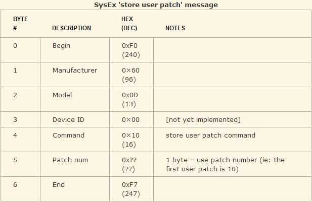 - La segunda manera de almacenar datos de usuario parche es a través de mensajes SysEx de MIDI. Esto puede ser más complicado, pero más cómodo – por lo menos en mi caso. Un mensaje SysEx de 7 bytes que hará que los Zeta Reticuli guardar los ajustes de EQ actuales a un parche de usuario especificado es como en la imagen titulada "mensaje de usuario almacenar SysEx"