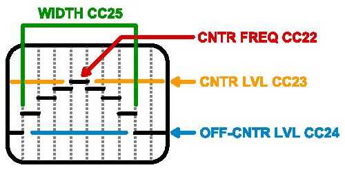 - cc23: nivel central: El nivel de la frecuencia central. Si se trata de un valor más alto que el nivel fuera del centro habrá un efecto de paso de banda, si baje va a haber un efecto de bloque de banda o "muesca".