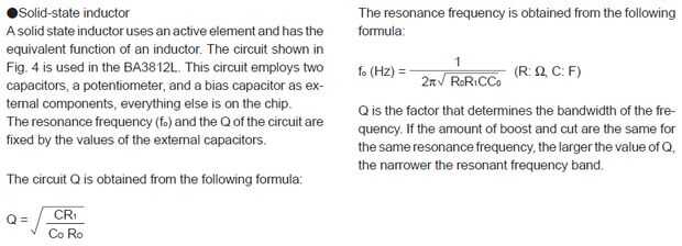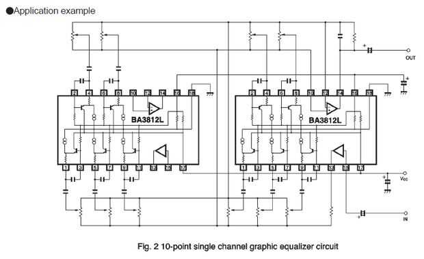 - Ecualizador: La sección EQ se basa alrededor de chips de Rohm BA3812L (2). Sinceramente solo se toma directamente de la nota 10-banda de la aplicación de la hoja de datos. La premisa básica es que cada banda de frecuencia se fija por dos condensadores. El primero (A) establece la frecuencia resonante (específicas) y los conjuntos segundo de ancho de banda (Q). La hoja de datos tiene la fórmula para determinar estos valores. Los valores y sus bandas de frecuencia resultante que usé son los siguientes. Una vez que una banda de frecuencia está aislada del resto de la señal de esta manera se utiliza un potenciómetro para variar su volumen antes de ser recombinado con el resto de la señal y establecido a través de la salida de jack 1/4 de pulgada. Los chips AD5206 (potenciómetros digitales de 10 6 k) se utilizan en lugar de macetas estándar por lo que pueden ser controladas en SPI por el Teensy.