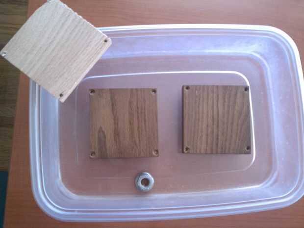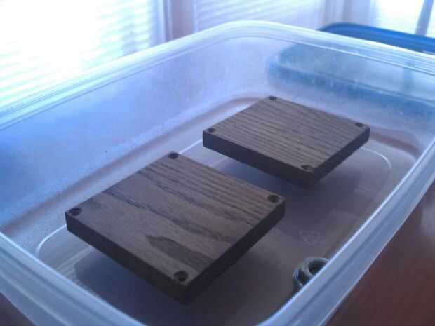 Mi proceso es muy sencillo. Una vez que la pieza está lista para teñirse frote con 2 o 3 manos de aceite de linaza, dejarlos secar en el medio. Este primer paso engrase realmente añade profundidad y parece acelerar el proceso. Usted necesitará un lugar hermético para permitir que el proceso de tinción fumigatory a ocurrir. Esto puede ser una bolsa de basura enmarcada hacia fuera con restos de madera o, como en este caso, un recipiente tipo Tupperware. Sólo asegúrese de que es hermética por lo que el amoniaco no se evaporan y abandonar la zona que huele como un laboratorio de metanfetamina. Para piezas de grandes tamaño puede ser beneficiosa montar un pequeño ventilador o alguna otra forma de obtener el aire circule dentro de la 'tienda' para que el fondo no mancha más rápido que la parte superior. Después de la última capa de aceite de linaza, seco o no, puse una cantidad al azar y de amoníaco en la 'tienda de humo' y el artículo de espacio hasta de amoníaco. En el Tupperware tuve los caso extremos en tuercas de mariposa. Debe intentar mantener el área de contacto entre la pieza y sus discos tan pequeños como sea posible. Los puntos de contacto recibirán menos amoníaco y pueden mostrar más ligeros. Por esta razón de también no es mala idea para volver a colocar la pieza sobre los espaciadores cada pocas horas.