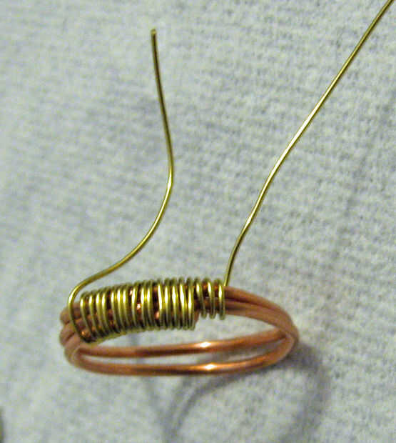 4. recorte un extremo del cable de calibre 18 cerca de las bobinas de bloqueo. Arena o archivo el liso extremo. Continúe envolviendo 24 bobinas de Georgia sobre el campo final del alambre y continuar 3-5 bobinas alrededor de los dos lazos del restante de la base del anillo.