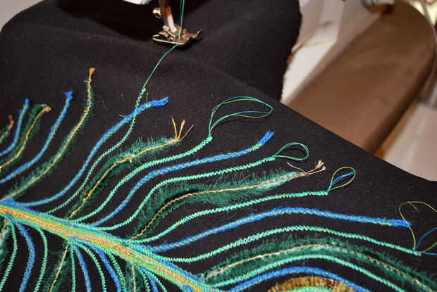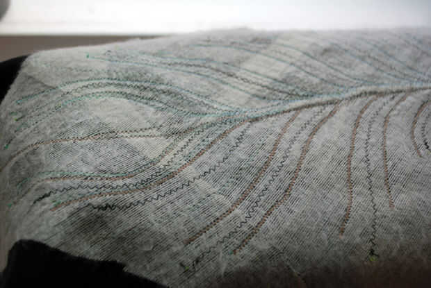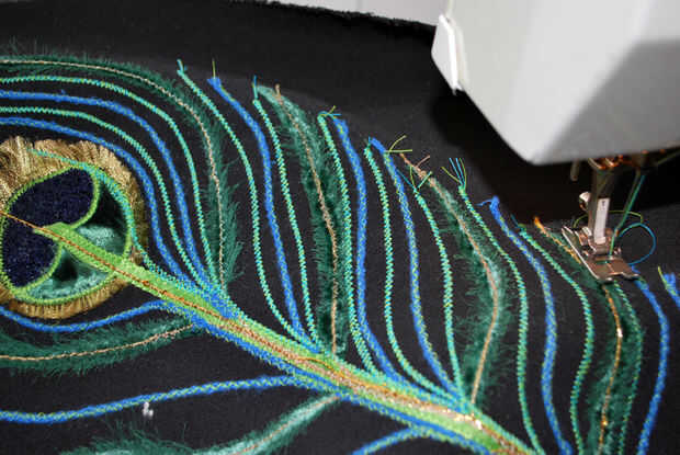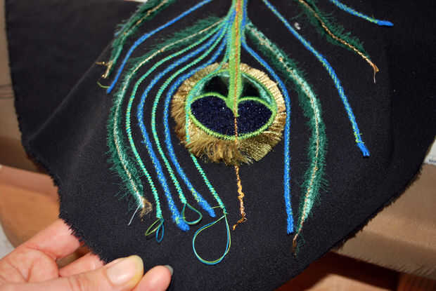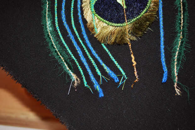 Estoy usando una puntada zig-zag roscada doble estrecha para crear hojas en los espacios abiertos entre el terciopelo y los filamentos de la bufanda azul. Me Inicio en uno de los espacios abiertos a lo largo de la espina dorsal cerca de la parte superior de mi pluma y crear un arco suave y de alrededor del ojo. Cuando llego a la parte superior de mi fronda volver puntada un poco, dejo un lazo de hilos y vuelta a coser encima de la línea otra vez. Esto hace una fuerte y muy visible de la fronda. Entonces mueva hacia abajo la columna y empezar el proceso nuevamente.
