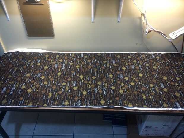 Por lo tanto, pone fuera plana y suavizar cualquier arruga, entonces establecer su material de apoyo sobre esa cara para arriba, como dije antes de que se puede utilizar cualquier estilo de respaldo que desee o varios pedazos cosidos juntos, sólo asegúrese de tener una pieza aproximadamente una pulgada más grande la parte superior todo y esto también , usted no quiere cualquier arruga aquí como aparecerán más tarde y difícil de salir después de planchar.