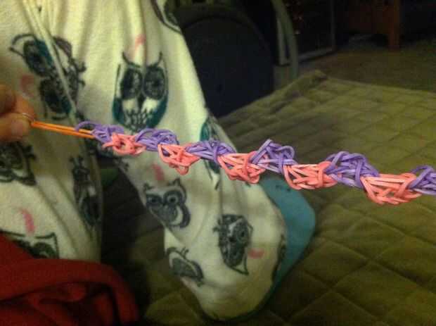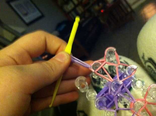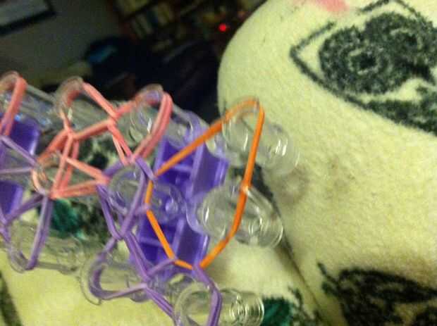 cosas que usted necesita:s-clipganchotelarbandas de gomaPaso 1: a partir Puso sus bandas en una posición de zig zag como en el cuadro hasta llegar al final. Utilicé color de rosa ya que tengo muchos.Paso 2: engancha El telar alrededor del tirón por l