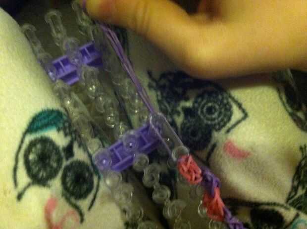 cosas que usted necesita:s-clipganchotelarbandas de gomaPaso 1: a partir Puso sus bandas en una posición de zig zag como en el cuadro hasta llegar al final. Utilicé color de rosa ya que tengo muchos.Paso 2: engancha El telar alrededor del tirón por l