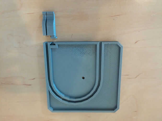 El adaptador de cartucho imprime en 2 partes. Montar la toma del adaptador el pedazo del cuello y presiona en la ranura T en la bandeja del adaptador. Las piezas deben ir juntos firmemente. Asegúrese de que las piezas estén completamente insertadas como esto afecta a la alineación de los filamentos y tubo de filamento.