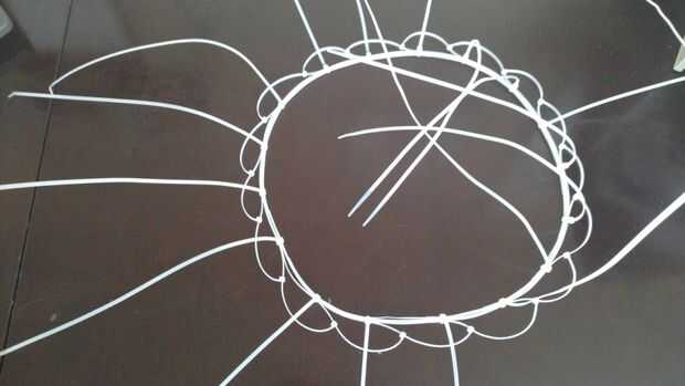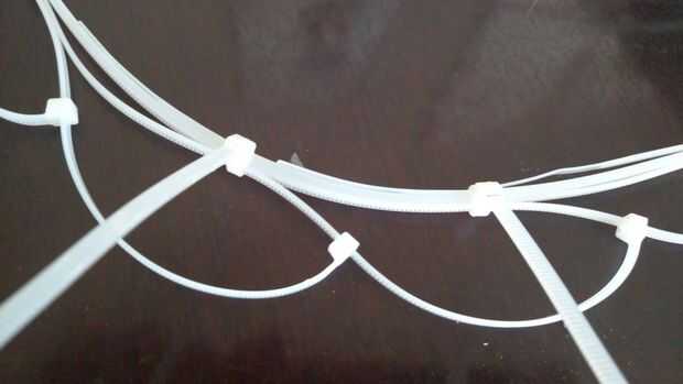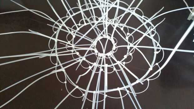 Esta bola es de abrazaderas de plástico (zap correas) y tiene una bonita coloración matemática.Se necesita:60 lazos pequeños zip (correas, ataduras de cables plásticas de zap).  Ataduras de cremallera grande son más difíciles de hackear para este pro