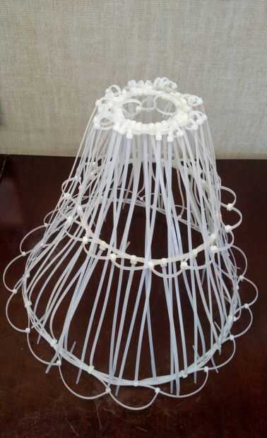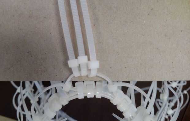 Mirando hacia atrás en el anillo superior, adjunto tres ataduras de cremallera 16 pulgadas a cada uno de los pétalos.