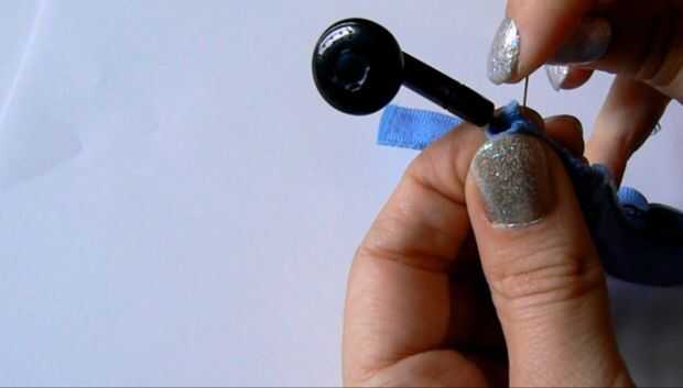 Doble el borde de la tela de la cremallera alrededor del cable de auricular y puntada hacia abajo.