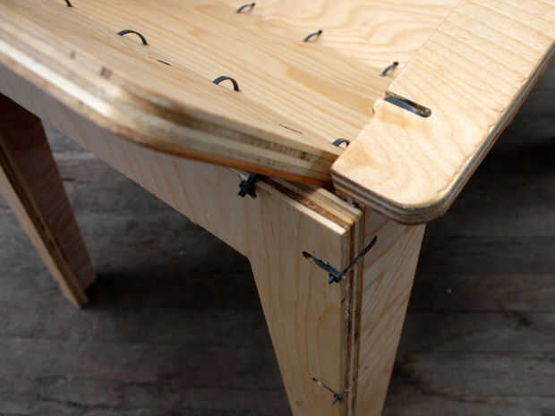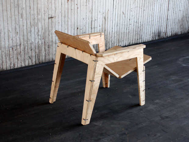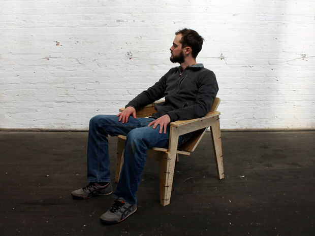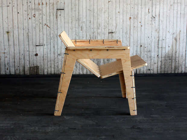 En lugar de tornillos de barril exasperante de IKEA, o el proceso sudoroso de forzar las articulaciones de la fricción, usé zip lazos para sujetar a la silla. Son baratos, fuerte y no requieren de ninguna herramienta, permitiendo que cortar aparte y puntada atrás juntos cada vez que necesite moverse. El sillón Zip Tie tiene sólo nueve piezas y puede recortarse de una media hoja de madera contrachapada. Paneles ergonómico articulados cuna el cuerpo como una hamaca.