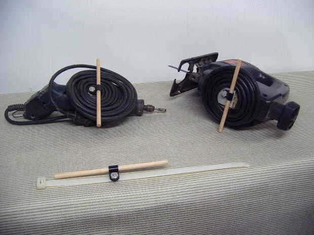 5. Cuando termine con la operación de la herramienta, pivote varilla pasador para que el cordón se puede envolver alrededor de la varilla de pasador como se muestra en el cuadro para almacenaje de herramienta.