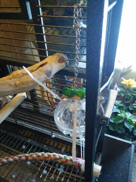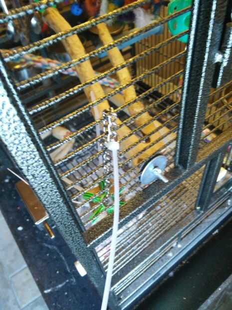 Fije la cadena en algún lugar en la jaula. Puede utilizar un clip de C, sin embargo debido a uno de mis loros abrir los clips, yo ahora zip cosas de amarre a la jaula. Asegúrese de que el cordón es apretado y en el exterior de la jaula para que el loro no mastica fuera el juguete.