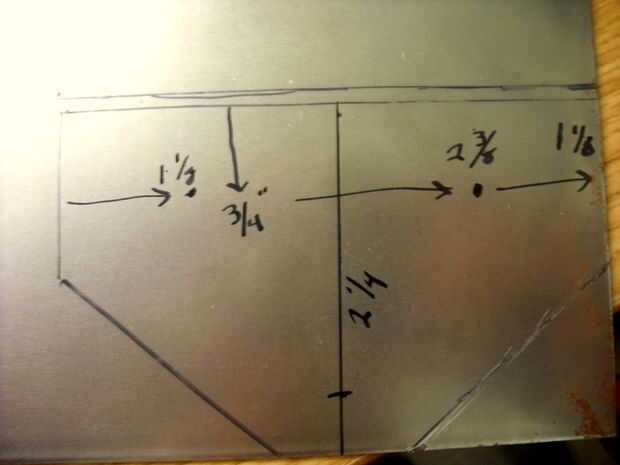 A continuación debe esbozar su diseño de marco en un pedazo de metal de hoja. He utilizado un patrón algo triangular. Es importante tener las medidas exactas porque equilibrio es clave para un dispositivo como este. Mis medidas eran 4.5 "x 1,5" x 2 1/4 x 1 "x 2 1/4 x 1,5. Hizo esto para ambas piezas y medir los puntos donde le Taladre los agujeros para los ejes y de los handels para ir. Coloqué mis agujeros axel; abajo 3/4" de la parte superior. De izquierda al centro del eje agujero es 1 1/8" y el espacio en el siguiente orificio de axel es 2 3/8 pulgadas que te deja con 1 1/8" a la derecha del marco.