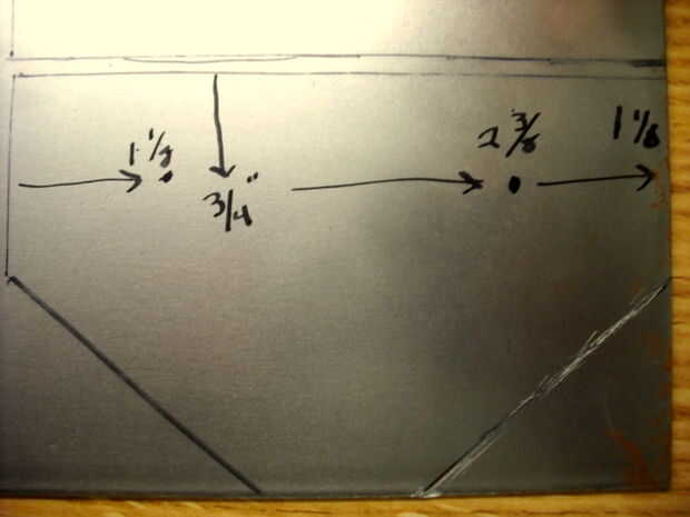 El agujero de la handel medí desde la parte superior que era de 4.5" a través de. Marqué mi 2 1/4" punto y dibujó una línea hasta la zona inferior que cruzó en 1/2". Me mide 1/2" hasta la línea que había dibujado y marcado el centro de donde le taladre el agujero para los handels. Después de perforar el agujero de 1/2" de la handel, habrá aproximadamente 1/4" dejaste entre la parte inferior de la handel y la parte inferior del marco.