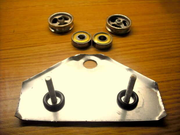 Todo, desde este punto es más o menos. Lugar 2, pernos 3/16 que tiene, a través de los orificios de top 2 en el cuadro y pone para que queden hacia arriba. Comenzar a agregar componentes a los tornillos a partir de los ' anillos tóricos. Siguiente los rodamientos y las ruedas de la polea. Añadir 2 de las tuercas de 3/16 hasta el final de los pernos, pero no apriete completamente. Apretarlos sólo hasta que el perno se siente estable. Esto permitirá que la rueda se mueva libremente. Ahora coloque el otro lado del cuadro en la parte superior y añadir las arandelas y las tuercas restantes. No apriete estos han colocado el conector de la tubería de acero en el centro de la unidad, al ras con los agujeros de los handels.