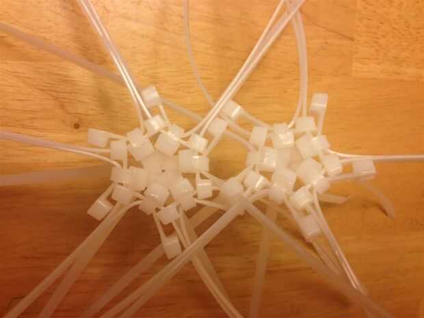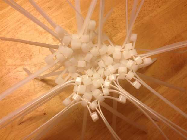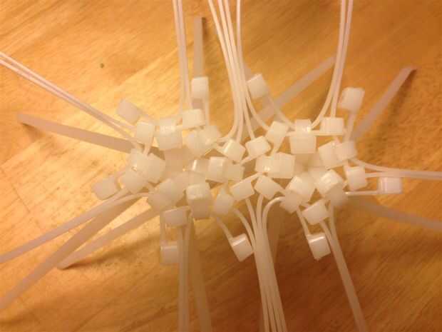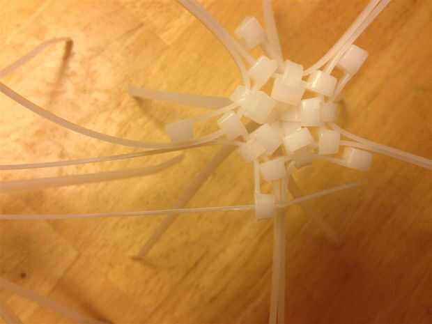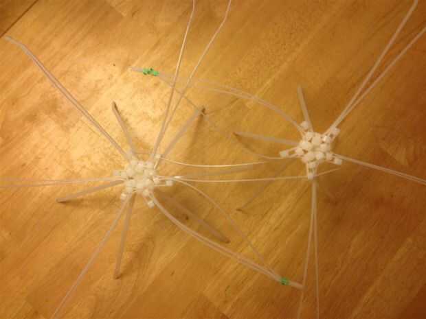Este paso puede ser un poco complicado, así que tómate tu tiempo. Usando los vínculos que se rosca a través de los lazos, conecte una cola desde el hexágono un jefe del Pentágono. Luego tomar la cola del Pentágono y conecte a la misma corbata de hexágono como fue utilizado previamente. Tire de las dos colas para endurecer las formas y continuar agregando piezas. A partir de un hexágono en el medio, conectar una cola de cada uno de los cinco hexágonos a las colas del Pentágono. Tener un balón de fútbol junto a la de referencia en este paso ayuda.