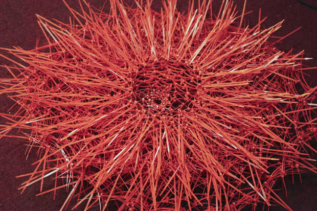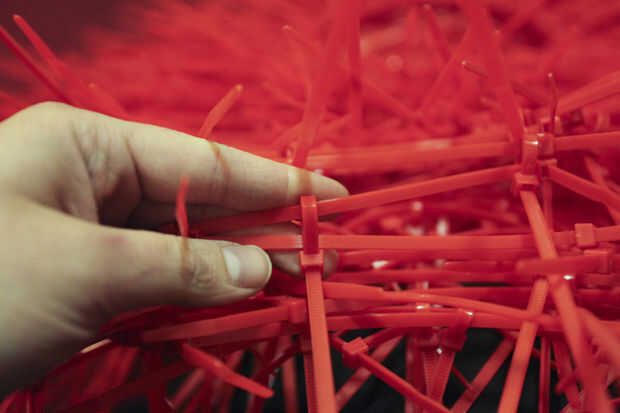 Esta bola es de abrazaderas de plástico (zap correas) y tiene una bonita coloración matemática.Se necesita:60 lazos pequeños zip (correas, ataduras de cables plásticas de zap).  Ataduras de cremallera grande son más difíciles de hackear para este pro