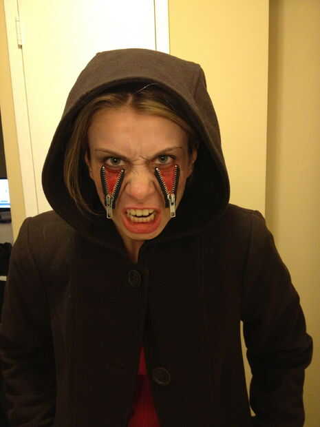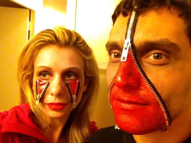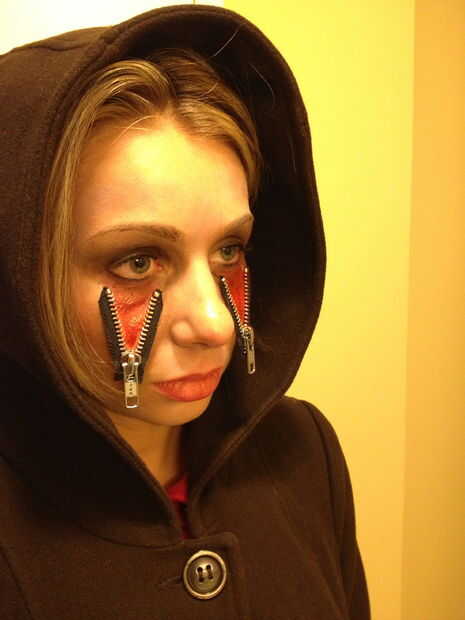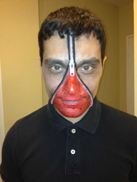 Empezamos por recortar las cremalleras a la longitud. Luego aplicamos goma de espíritu a la parte trasera de las cremalleras y deje que se seque al tacto, pero todavía ligeramente pegajoso. Luego aplicamos las cremalleras a nuestros rostros. Llenamos en las secciones «abierto» de caras con pintura roja usando una combinación de esponjas y cepillos. Esto le dio la ilusión de la carne expuesta debajo de la piel. Entonces, cepillado de sangre falsa sobre la carne roja para darle un efecto brillante y húmedo. Luego utilizamos una pequeña cantidad de pintura blanca para hacer que nuestra piel parezca un poco mayores o casi muerto. Usando pintura negra creamos líneas de sombras en los bordes de la cremallera y alrededor de nuestros ojos y pómulos.