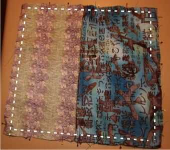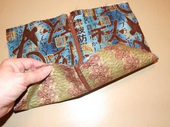 Gire a la tela para que los lados del derecho se enfrentan a uno otro con las 2 piezas de revestimiento en un lado y las 2 piezas de tela exterior en otro. La cinta de la cremallera y tela de costura deben ser on(towards) el lado del forro.