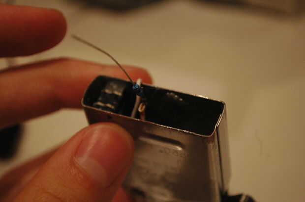 - Encontrar LED en el LED rojo y acortar ese alambre. Solde un resistor de 270 ohms a la pata y aislar con cinta aislante.