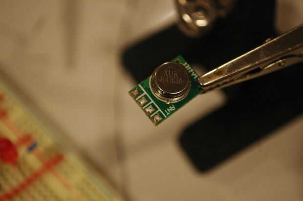 - La soldadura de los pines del módulo de RF a los lugares adecuados (Vcc al pin 8, GND al pin 4, datos al pin 6)