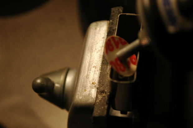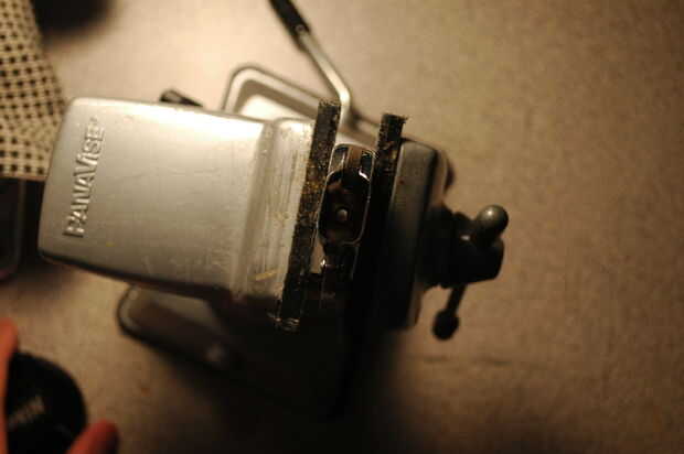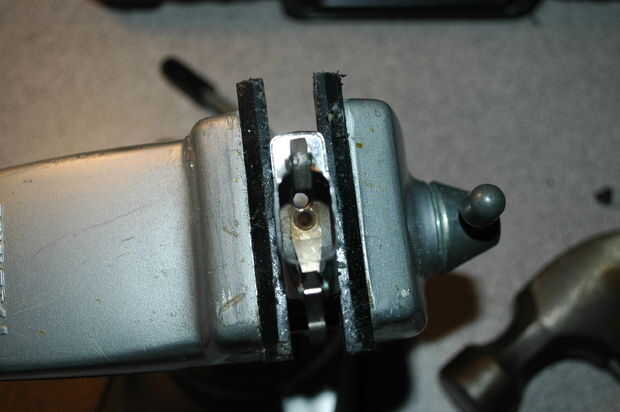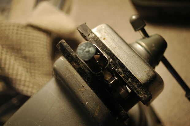 - Alinear el clavo entre la rueda de piedra y la mecha. Golpee el clavo ligeramente y luego más duro hasta que el clavo penetra en el acero.