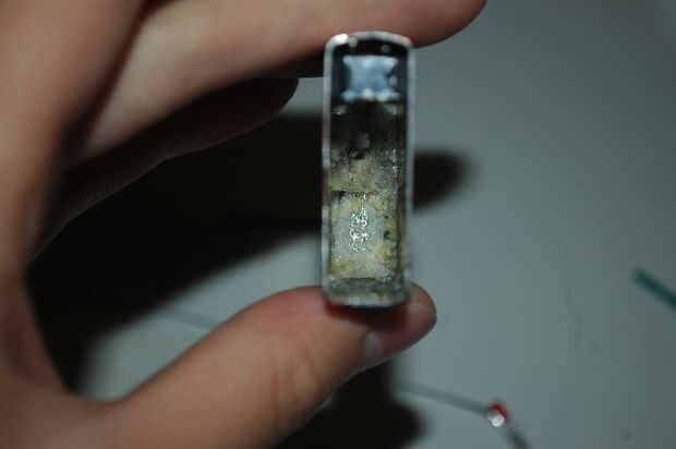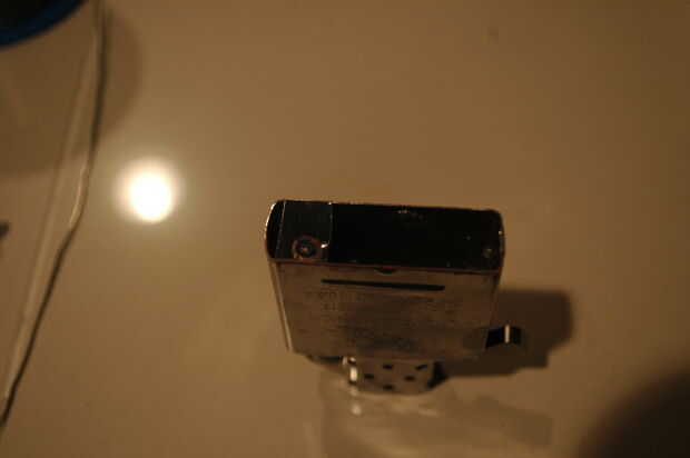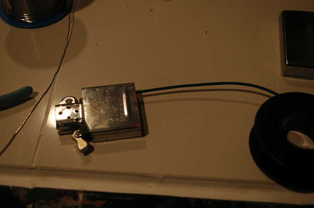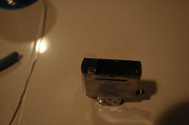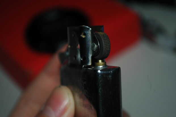 - Mantenga pulsado el botón sobre el tubo de latón y presione hacia abajo perpendicularmente en la rueda de pedernal. El botón debe tener un reconfortante 'clic'